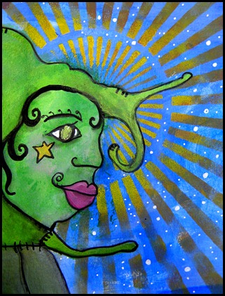 I added the blue background, then took out that great star burst stencil and added the bright yellow and orange burst that looks like it is coming from behind his head.