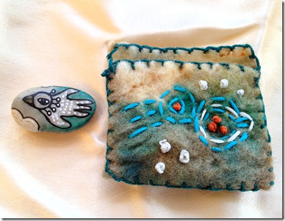 I have been happily stitching up little bag homes for my Rock Beings, using my own hand dyed wool bits and a lovely rainbow of embroidery floss.